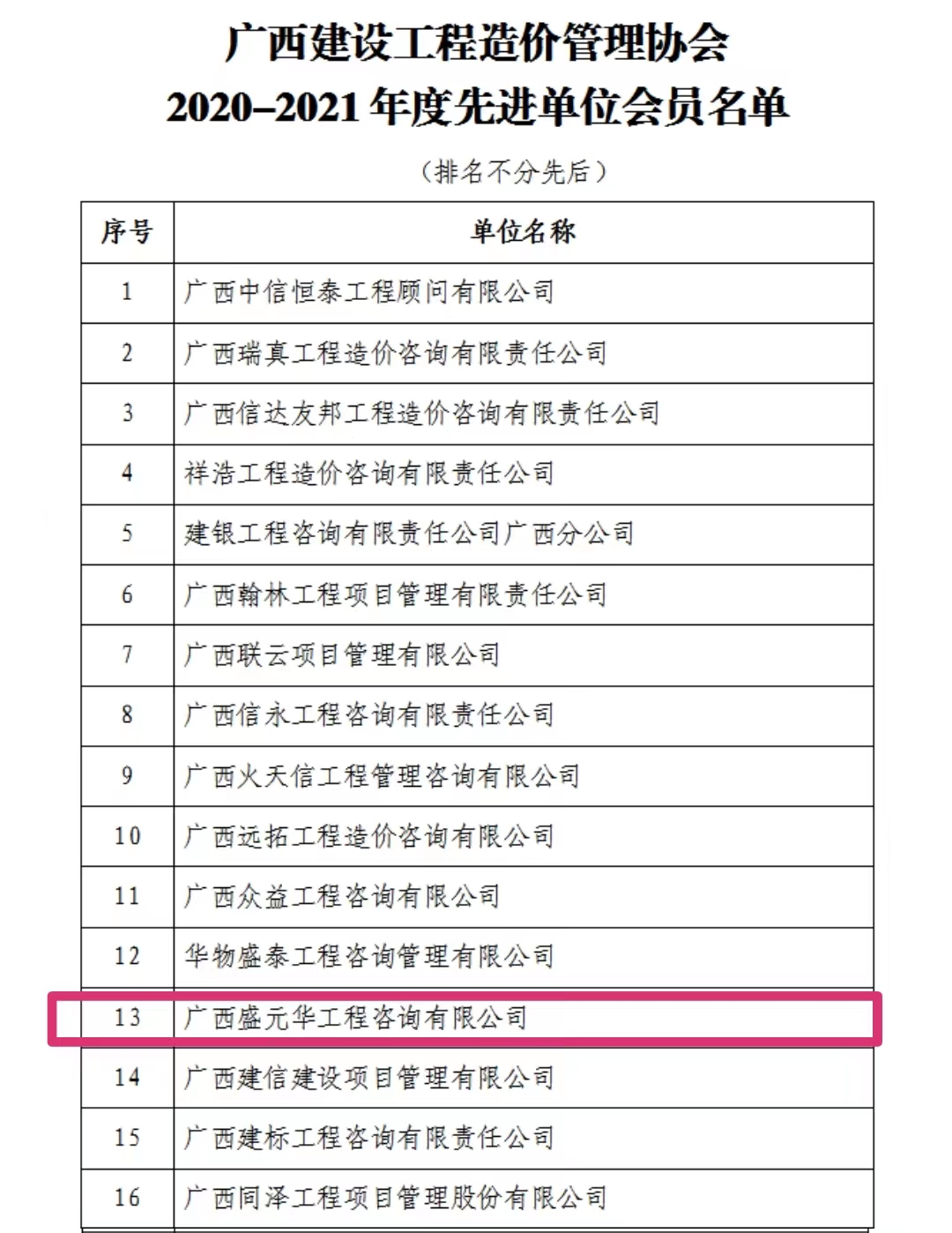 據(jù)悉,廣西盛元華至2019年以來蟬聯(lián)獲得廣西建設(shè)工程造價(jià)管理協(xié)會(huì)的先進(jìn)單位會(huì)員,這不僅是行業(yè)協(xié)會(huì)和社會(huì)各界對(duì)廣西盛元華篤行不怠,砥礪奮進(jìn)為廣大客戶提供高品質(zhì)服務(wù)的肯定,更激勵(lì)了每一位盛元華人以“誠信為本 有諾必踐”為宗旨,在未來的工作中不斷提高服務(wù)品質(zhì),提高行業(yè)競爭力而不懈努力!