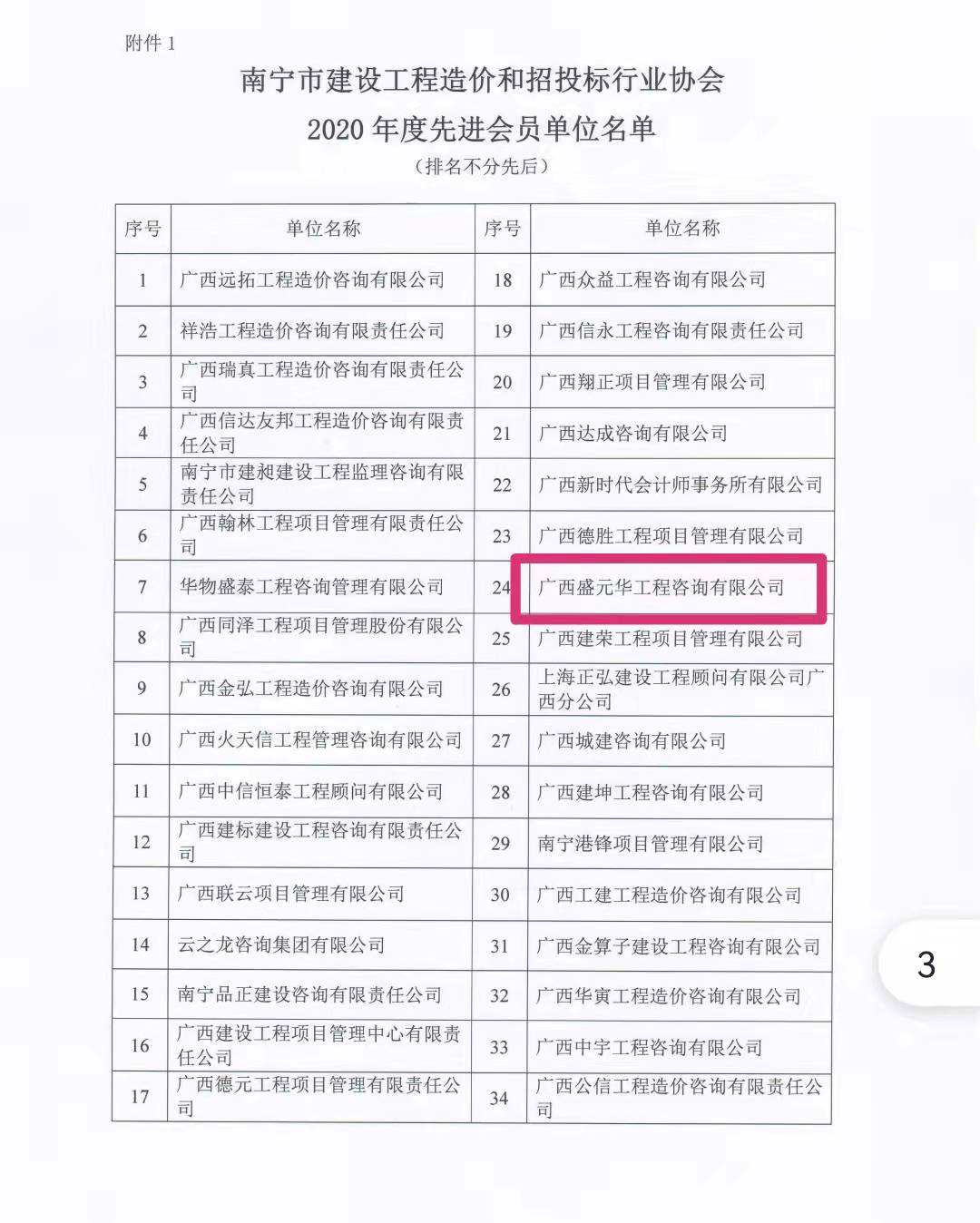 | 喜訊!熱烈祝賀廣西盛元華榮獲南寧市建設(shè)工程造價(jià)和招投標(biāo)協(xié)會(huì)2020年度先進(jìn)會(huì)員單位 |