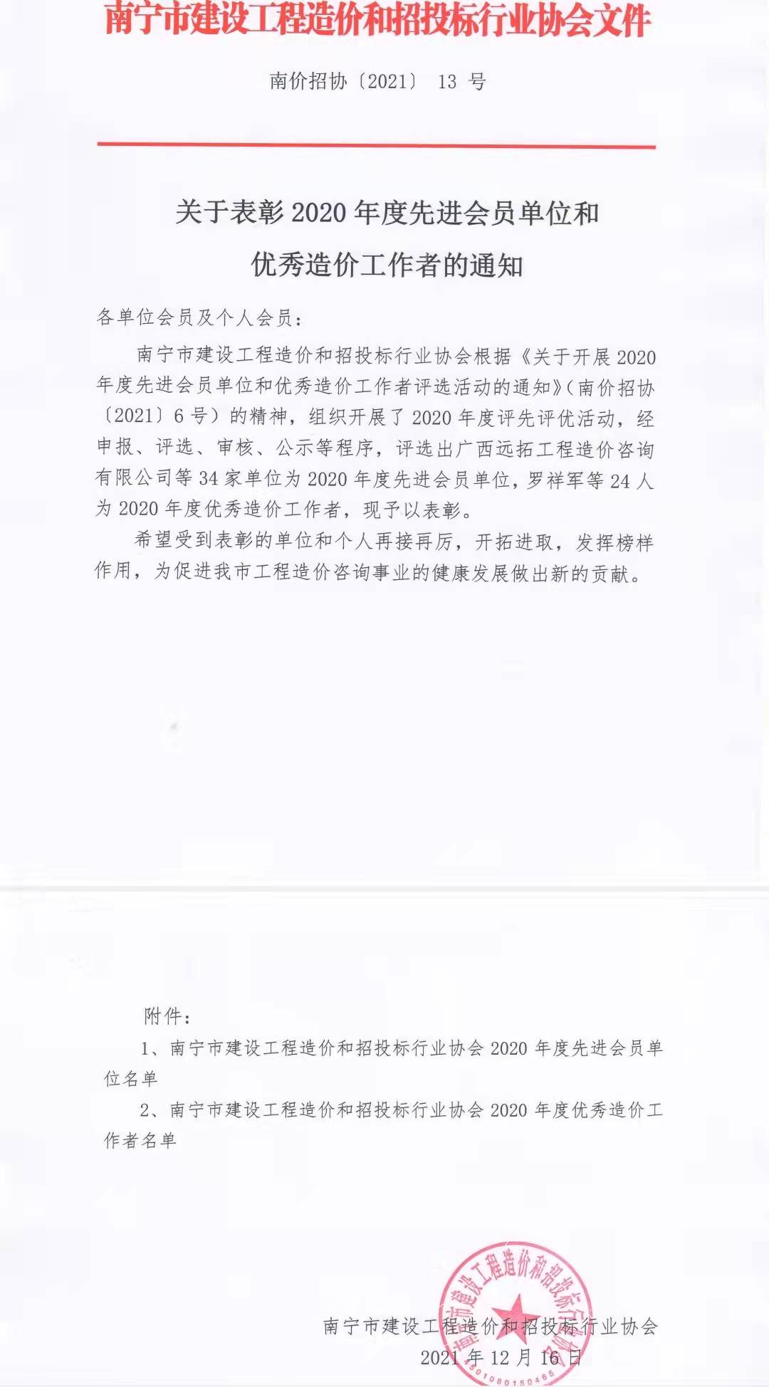 12月16日,南寧市建設(shè)工程造價(jià)和招投標(biāo)協(xié)會(huì)發(fā)布年度評(píng)先評(píng)優(yōu)活動(dòng)的表彰通知,我公司以?xún)?yōu)秀的業(yè)績(jī),良好的誠(chéng)信評(píng)價(jià),再次榮獲南寧市建設(shè)工程造價(jià)和招投標(biāo)協(xié)會(huì)“2020年度先進(jìn)會(huì)員單位”榮譽(yù)稱(chēng)號(hào)。